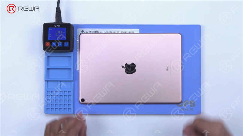 Legen Sie das iPad Pro auf eine Heizkissen und erhitzen Sie ihn auf etwa 70 °C. Trennen Sie den Bildschirm vorsichtig mit einem Stemmeisen ab. Achten Sie dabei auf den Winkel und die Richtung, damit die flexiblen Kabel nicht beschädigt werden.