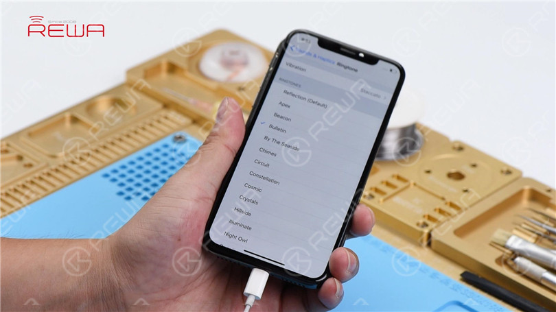 Wait for the motherboard to cool for 5 minutes. Now, let’s assemble the phone and test. Go to Settings>Sounds&Haptics>Ringtone. Select a default ringtone, normal output sound this time.